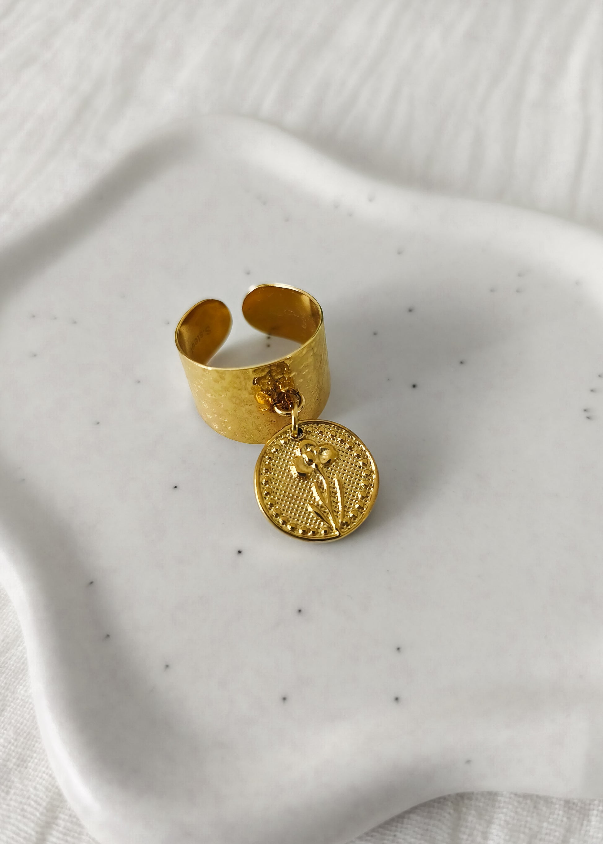 Cette bague dorée, personnalisée avec sa pampille en fleur de naissance, est un accessoire unique qui raconte une histoire. Que ce soit pour offrir ou pour ajouter une touche personnelle à ton look, elle incarne élégance et intemporalité