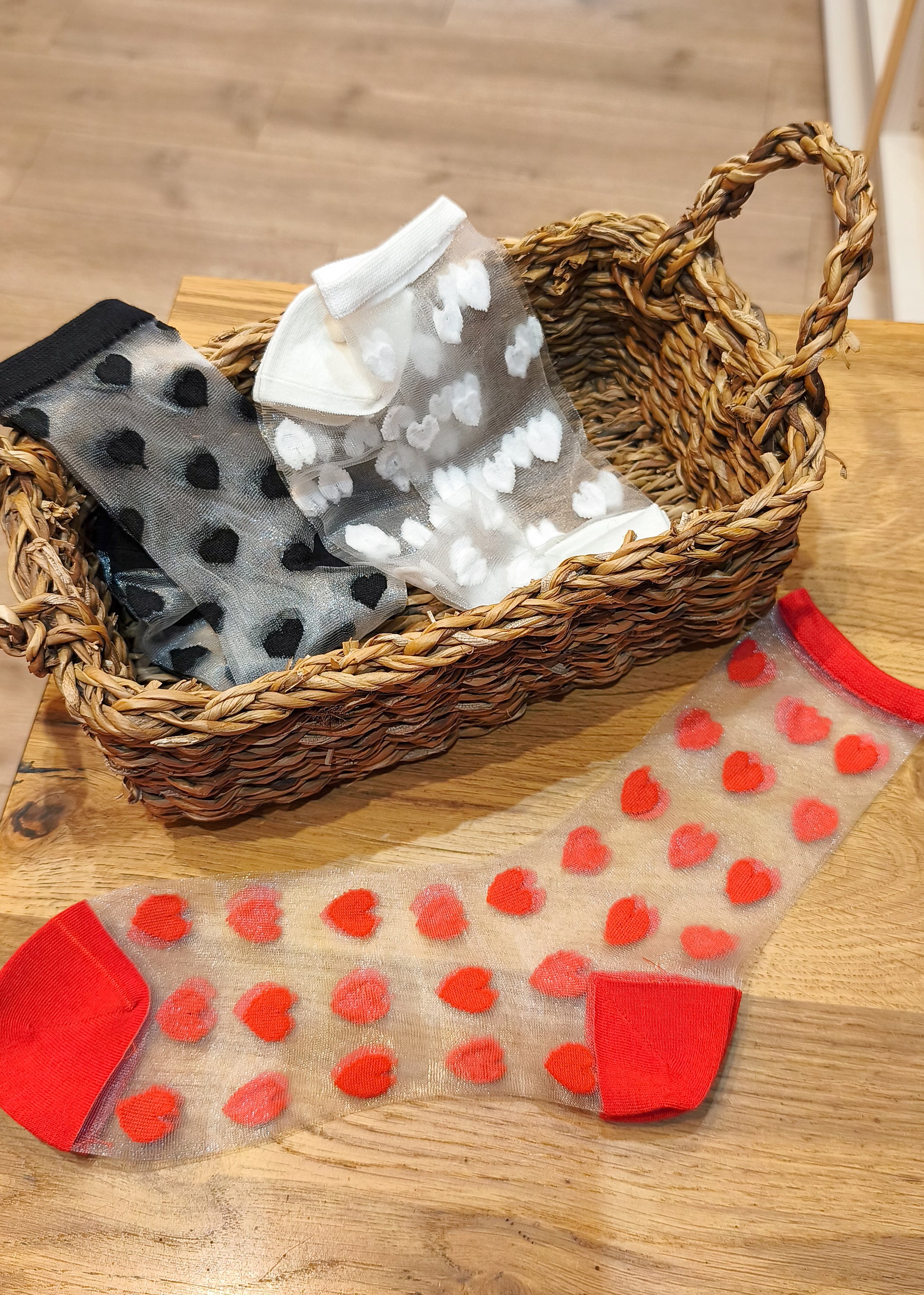 Chaussettes transparentes à motifs cœurs – Rouge, Noir & Blanc ❤️