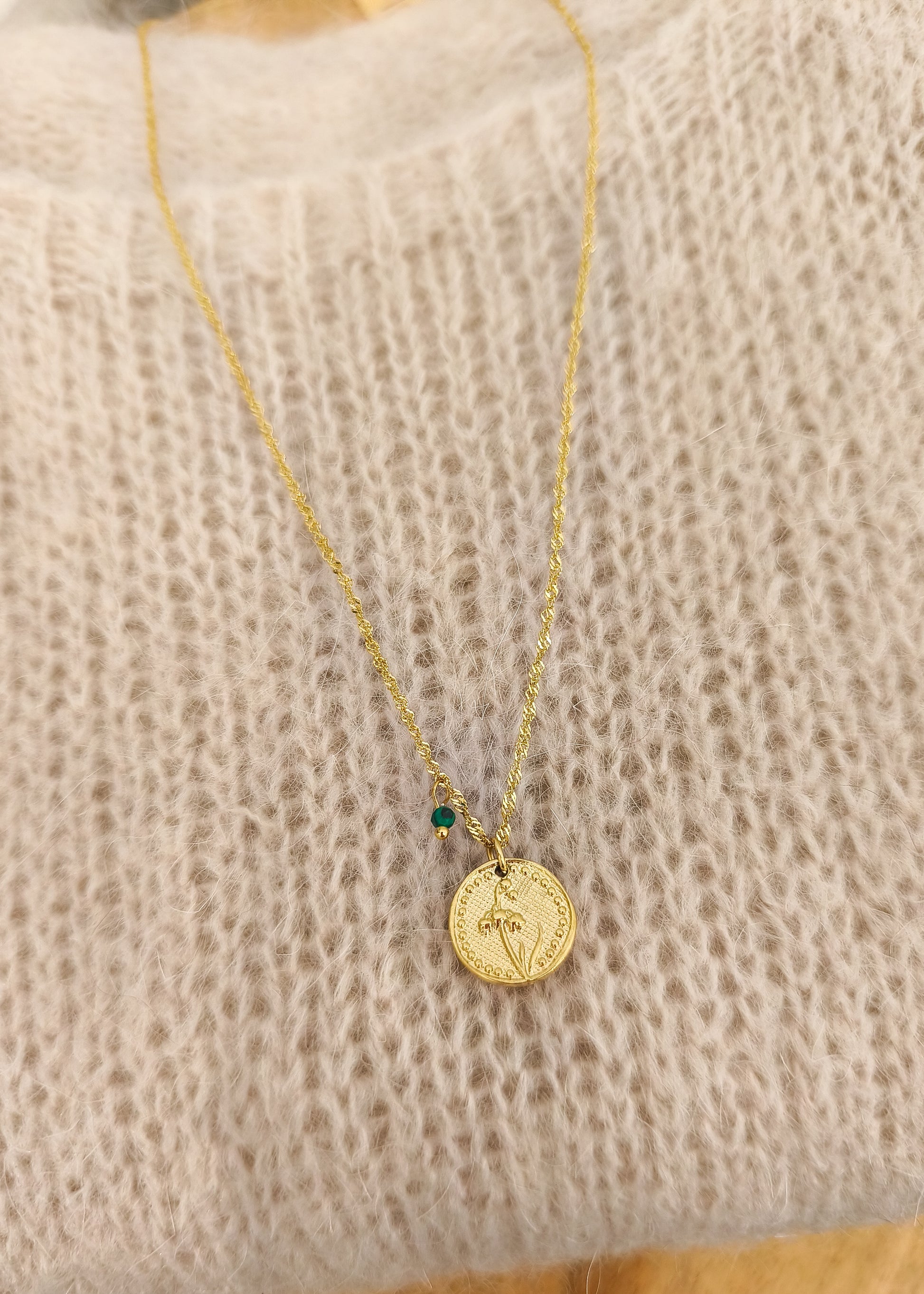 En acier inoxydable doré, il se compose d’une chaîne fine et élégante, ornée d’une petite pierre naturelle et d’un pendentif fleur gravé représentant ton mois de naissance. Un bijou à la fois minimaliste et symbolique, parfait pour offrir ou se faire plaisir