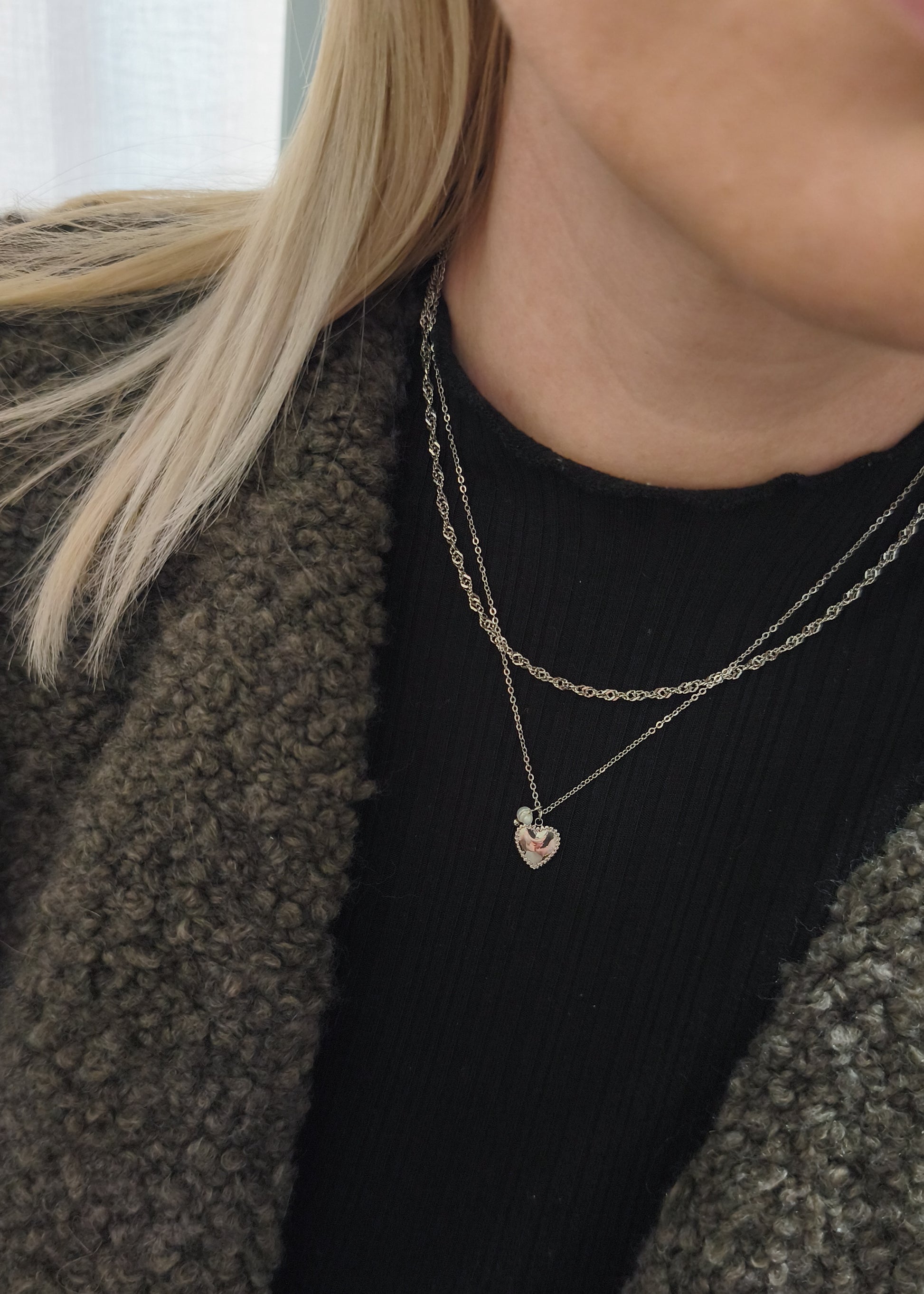 Ce collier en acier inoxydable argenté se compose d’un pendentif cœur aux contours milgrain, au charme subtil, accompagné d’une petite perle d’eau douce. L’association des textures crée un équilibre parfait entre féminité, élégance et modernité