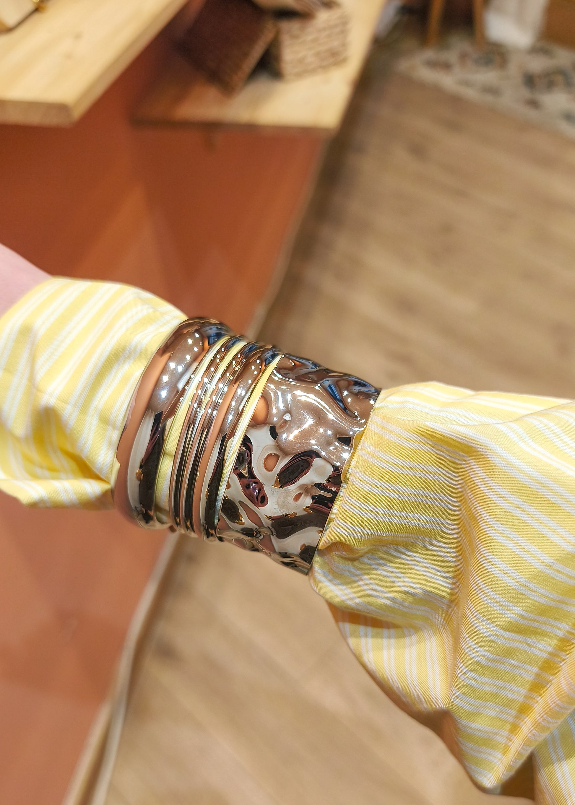 - Porte-le en accumulation avec d’autres joncs argentés ou dorés pour un jeu de contrastes ultra tendance. Effet garanti avec une chemise oversize ou un top sans manches !